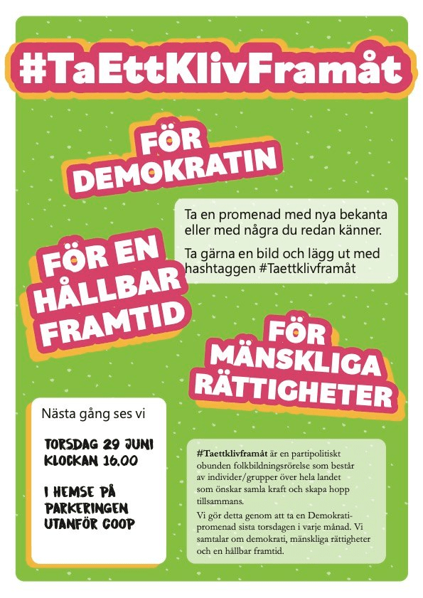 Vi var sex personer som samlades för en första promenad för demokrati, mänskliga rättigheter och en hållbar framtid i torsdags i Hemse. Den yngsta var 25 och den äldsta 79. Vi ägnade oss åt att bekanta oss med varandra och samtalade om sånt vi oroar oss för som klimatförändringarna och de förslag om att lärare, bibliotekarier och sjukvårdspersonal ska tvingas ange papperslösa. Håll yrkesetiken högt! Vägra angiveri!
