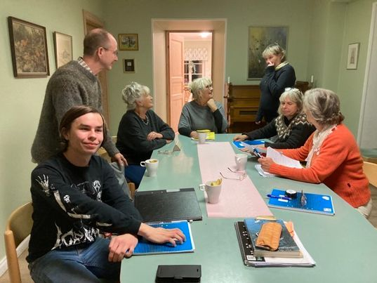 I studiecirkeln möts vi i utvecklande samtal. Här i skrivarcirkel i Halla bygdegård i Vuxenskolans regi.