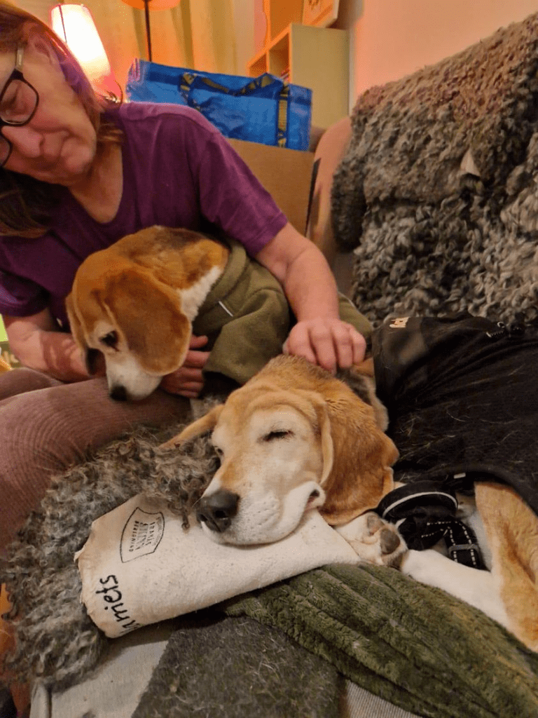 Ginny och Elvis ”the beagles” vilar ut efter promenaden framåt i snön.