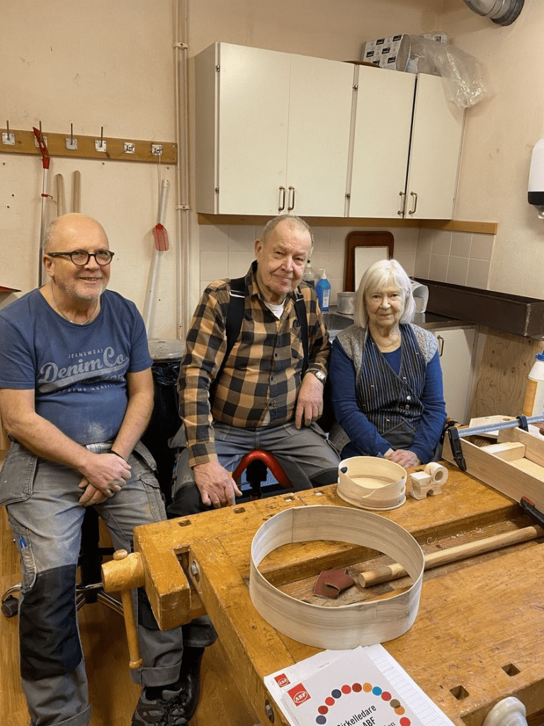 Vi är en grupp som träffas varje torsdag i vår snickericirkel i Kallhäll. Det är den bästa dagen i veckan säger Margit. Leevi som är cirkelledare är så duktig och vi i gruppen har en väldigt fin social gemenskap. Bo instämmer och säger att studiecirklar för oss äldre är viktigt för att vi ska må bra, hitta ett sammanhang och ett intresse att samlas kring.