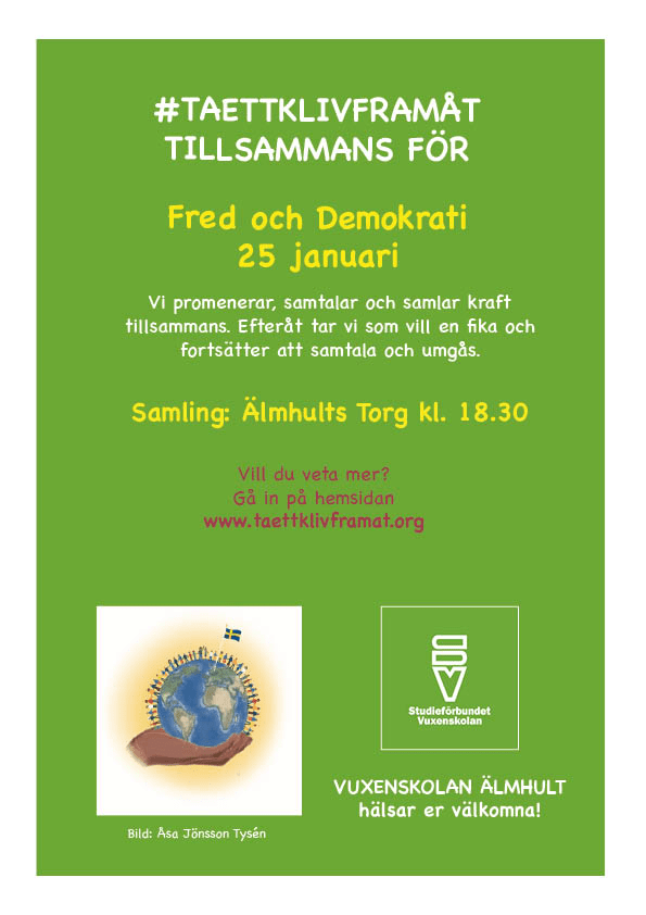 vi i Älmhult har ikväll gått en promenad för att ”Ta ett kliv FRAMÅT” #Taettklivframåt för demokratin, för mänskliga rättigheter och för en hållbar framtid. Och inte minst #Taettklivframåt för folkbildningen ![]()