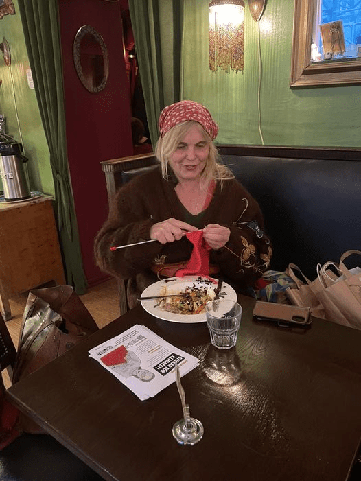 Stickar för klimatet på bästa cafeet, Blå Lotus. #stickaförklimatet #strikkforklima #knitforclimate #Taettklivframåt