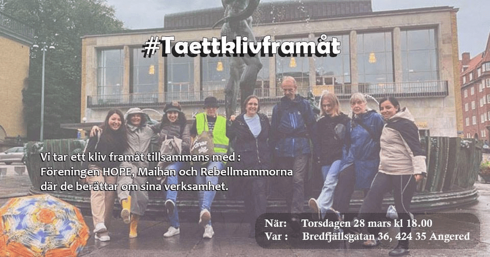 Föreningen HOPE, föreningen Maihan och Rebellmammorna Göteborgs berättar om vilka de är och vi fikar tillsammans. Sedan tar vi en promenad och samtalar för de som vill efteråt.